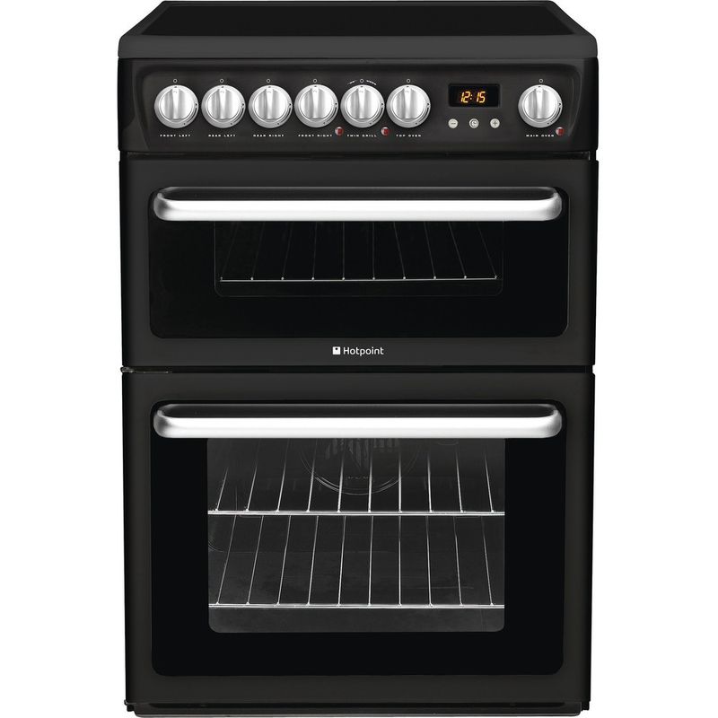 This Hotpoint freestanding double cooker features: 4 radiant plates. Black colour. Catalytic cleaning system. Electric power supply. 60cm width.