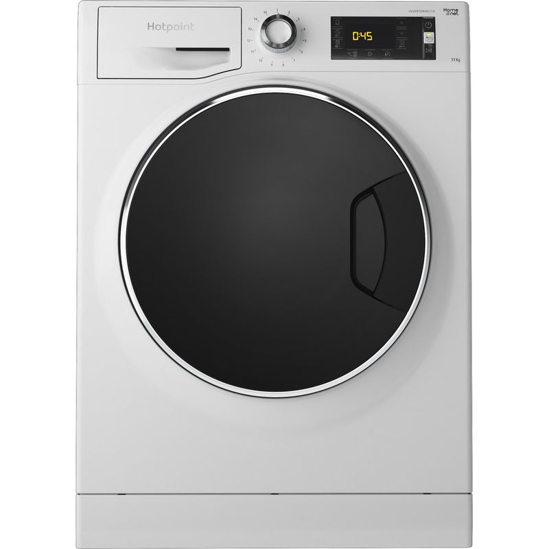 This Hotpoint freestanding front loading Washing Machine features: a spacious, large 11kg capacity. Outstanding A+++ energy rating, effectively reducing energy consumption by 20%. A fast, resource-efficient 1600 revolutions per minute spin speed. White colour.
