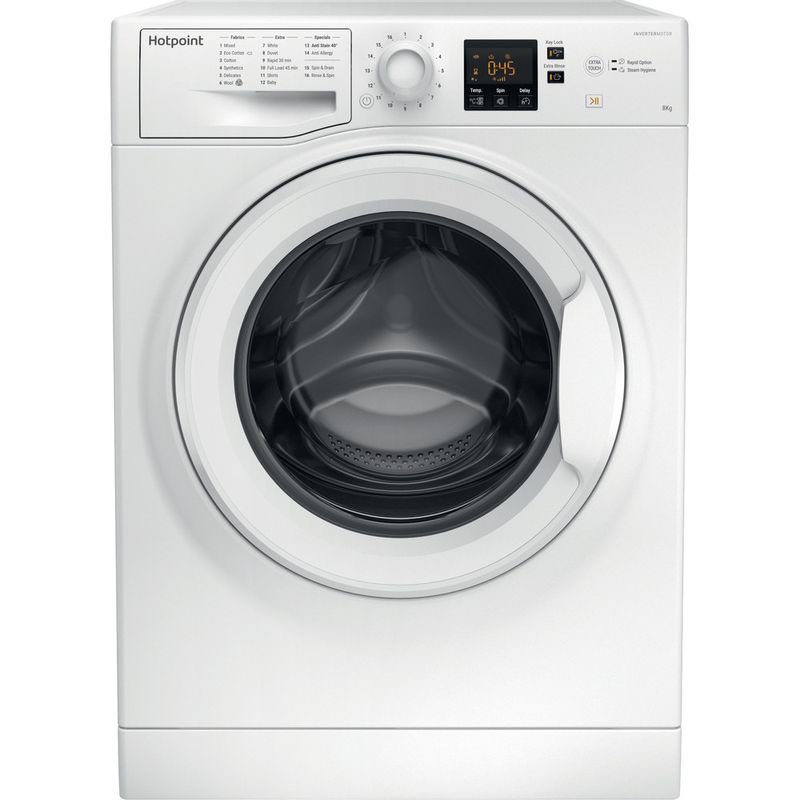 This Hotpoint freestanding front loading Washing Machine features: a spacious 8kg capacity. A fast, resource-efficient 1400 revolutions per minute spin speed. White colour.