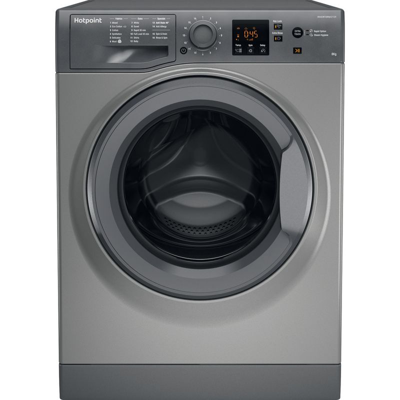 This Hotpoint freestanding front loading Washing Machine features: a spacious 8kg capacity. A fast, resource-efficient 1400 revolutions per minute spin speed.
