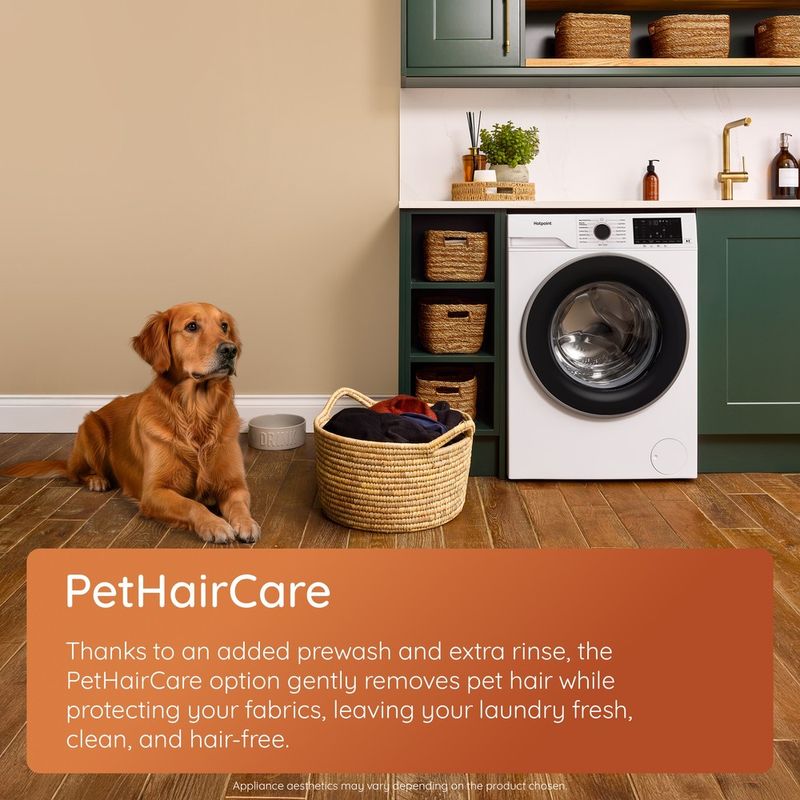 Make everyday laundry simpler with the black Hotpoint HBD 9681B ANTI STAIN UK 9kg+6kg AntiStain washer dryer, designed to wash and dry clothes with ease. Perfect for busy homes, it combines thorough cleaning with gentle fabric care, all while delivering efficient energy use. Take on tough stains with confidence thanks to Anti Stain, Hotpoint’s smart programme that tackles 24 common stains* using optimised temperatures, enhanced drum movements and longer rinses for consistently effective results. ColourCare helps keep colours bright for up to four times** longer, washing thoroughly at lower temperatures to protect fabrics and maintain softness. For homes with pets, PetHairCare uses an extra prewash and rinse to lift stubborn pet hair while keeping garments feeling soft and fresh. When time is tight, Full Load 45’ washes a full 9 kg load in just 45 minutes, making it easier to keep up with everyday laundry. Continuous Wash & Dry cycles take care of washing and drying in one go. The 6kg Wash & Dry is designed for cotton loads, finishing in under 4 hours, while the 3kg Wash & Dry handles mixed fabrics in the same time. For a quick refresh, Wash & Wear can wash and dry 2 shirts in 40 minutes, or up to 5 shirts in 60 minutes, so your favourite outfits are always ready. If you need items even faster, the Rapid option can reduce wash duration by up to 50%***, helping you stay one step ahead on laundry day. *24 types of stains: coffee, tea, fruit juice, collar stain, salad dressing, mayonnaise, ketchup, makeup, blood, sweat, red wine, pudding, mud, meal, chocolate, grass, egg, baby food, machine oil, coke, butter, jam, curry, coal. **Based on 3rd party test report, comparing washing results of new Hotpoint 20 ColourCare cycles to old Hotpoint model’s 5 Cotton (40°C) cycles. ***The % will vary according to load and programme selected.