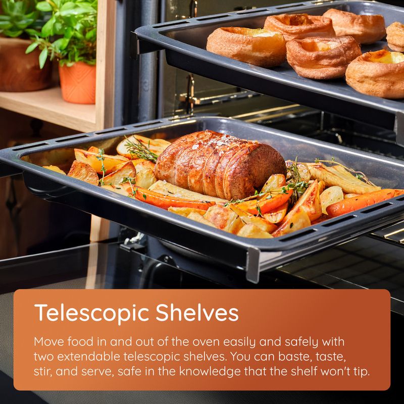 MyMenu selects the optimal settings for 60 recipes, including air-fried dishes, making meal preparation effortless. For added luxury, the oven includes 2 telescopic shelves and a soft-closing door.