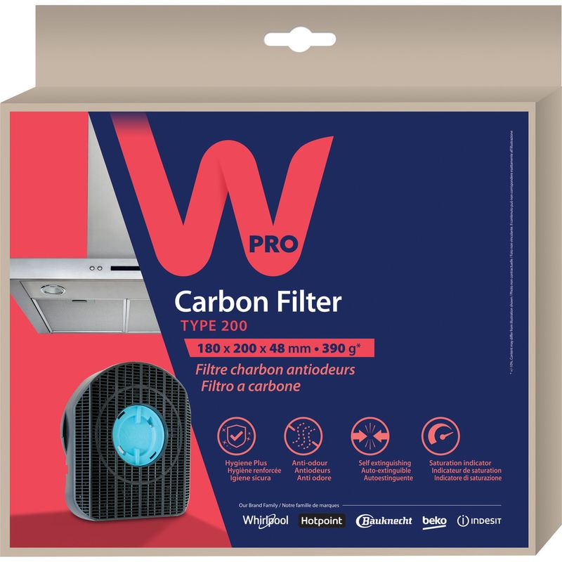 The Wpro extractor fan carbon filter CHF200/1 C00380118 offers a powerful absorbent action that protects against the spread of bacteria in the air. Your environment is healthier, which also reduce the risks of allergies. The performance is increased with the AC 40 quality charcoal. Its ability to absorb odours is 2 x greater than that of a traditional charcoal (AC 20). The auto-extinguish feature guarantees totally safe use (conforms to standard UL94: V-2). To ensure optimun performance it is recommended changing the filter every 3 months or when the indicator chage its colour.